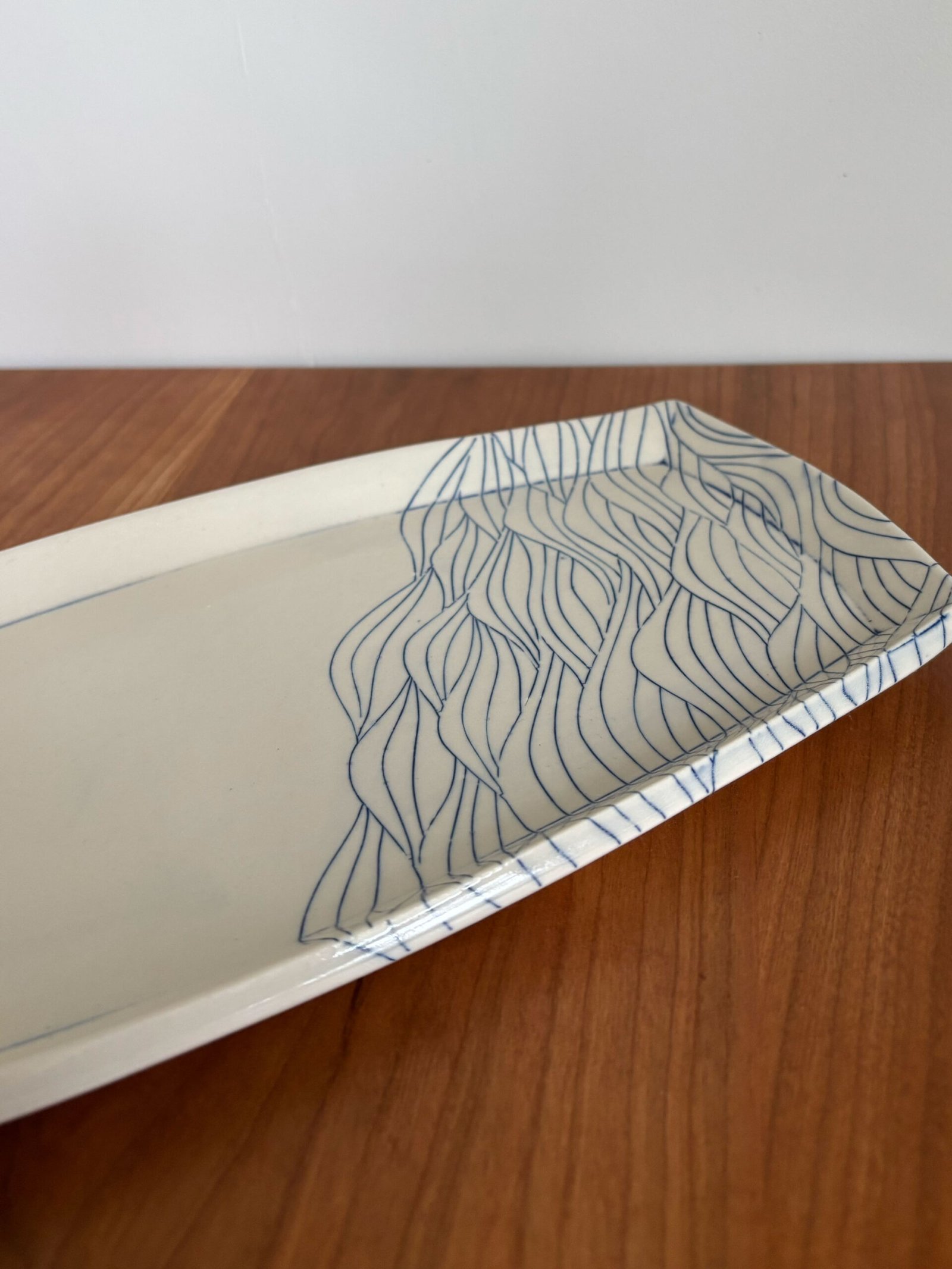 This is the MEDIUM hand built slab platter with hand carved, blue inlay design.