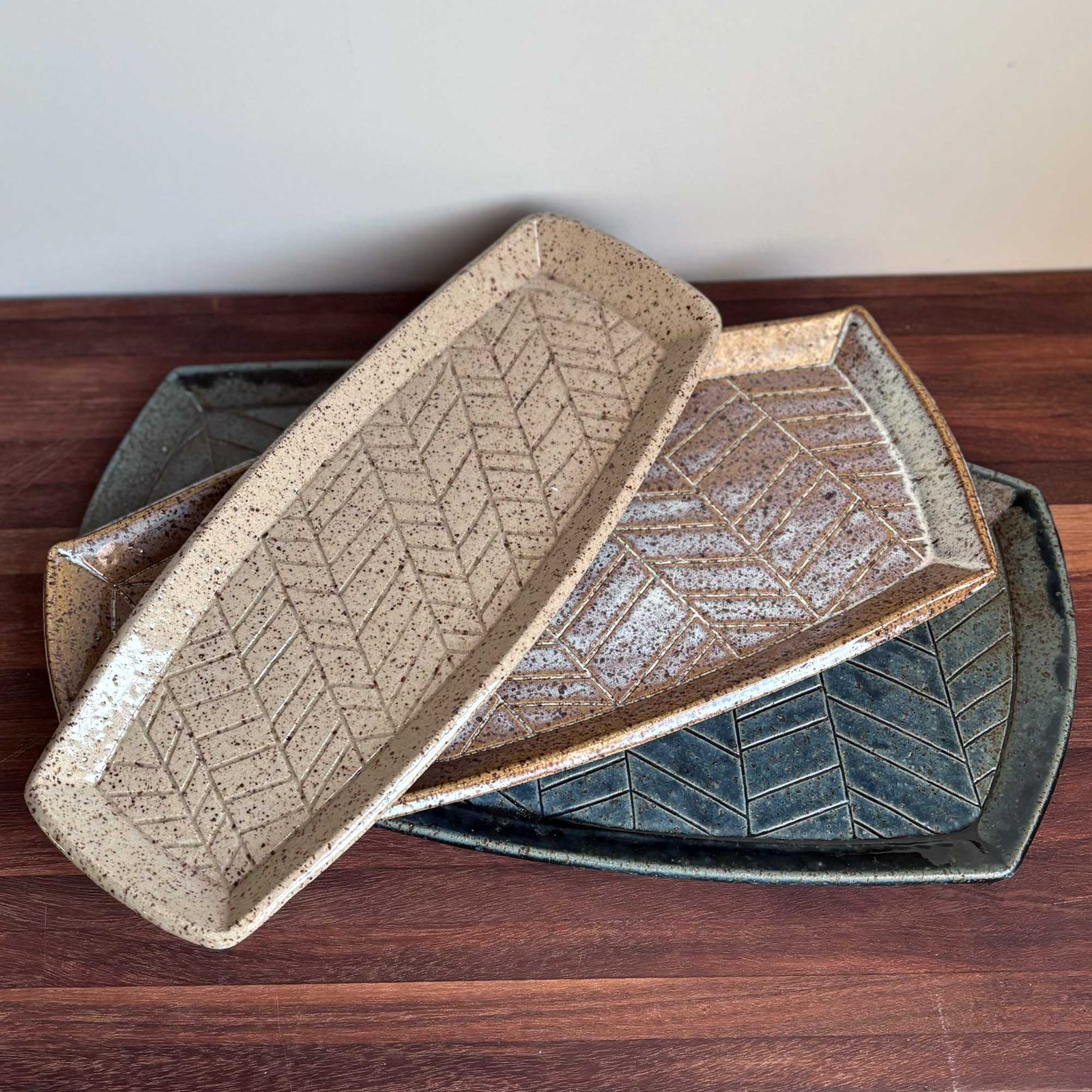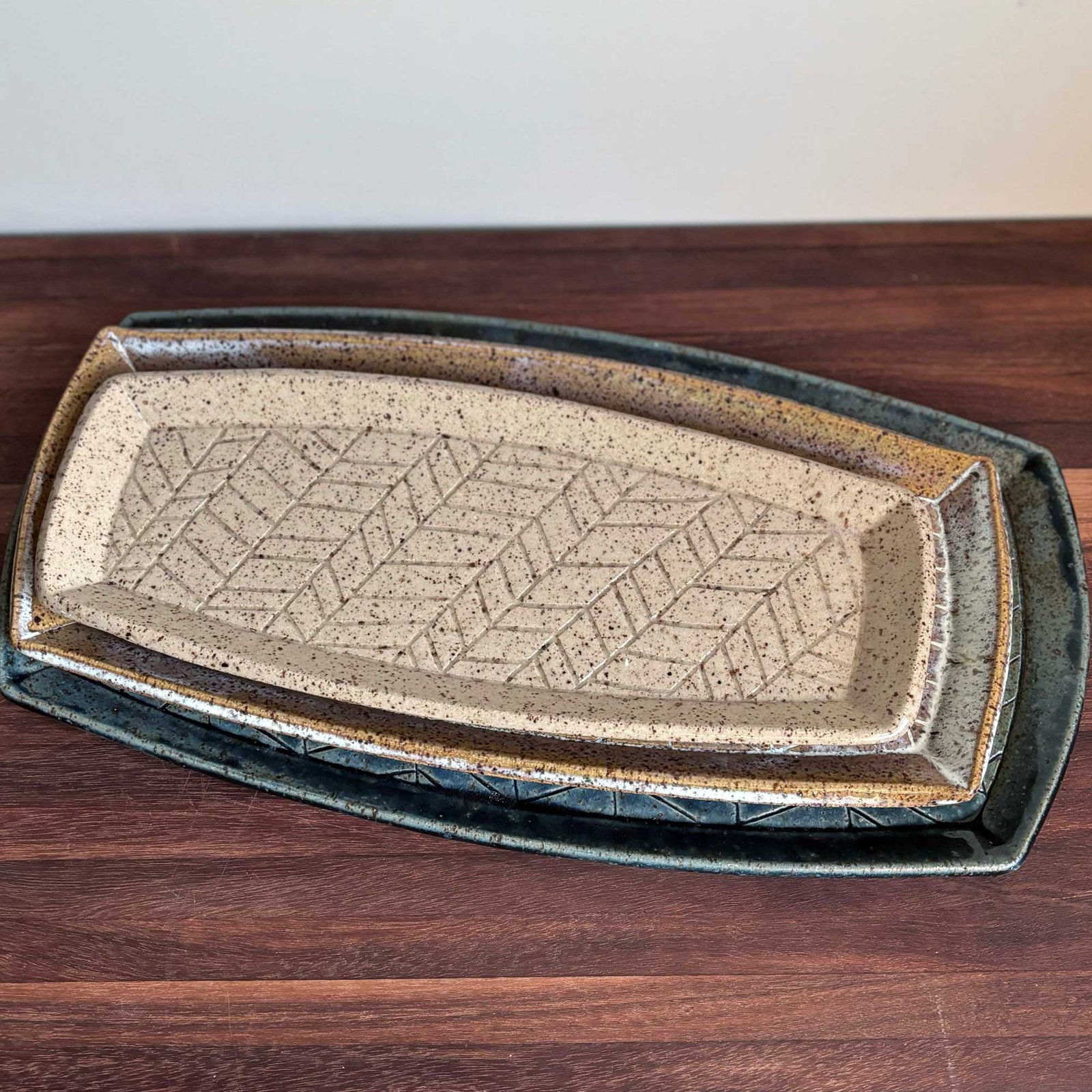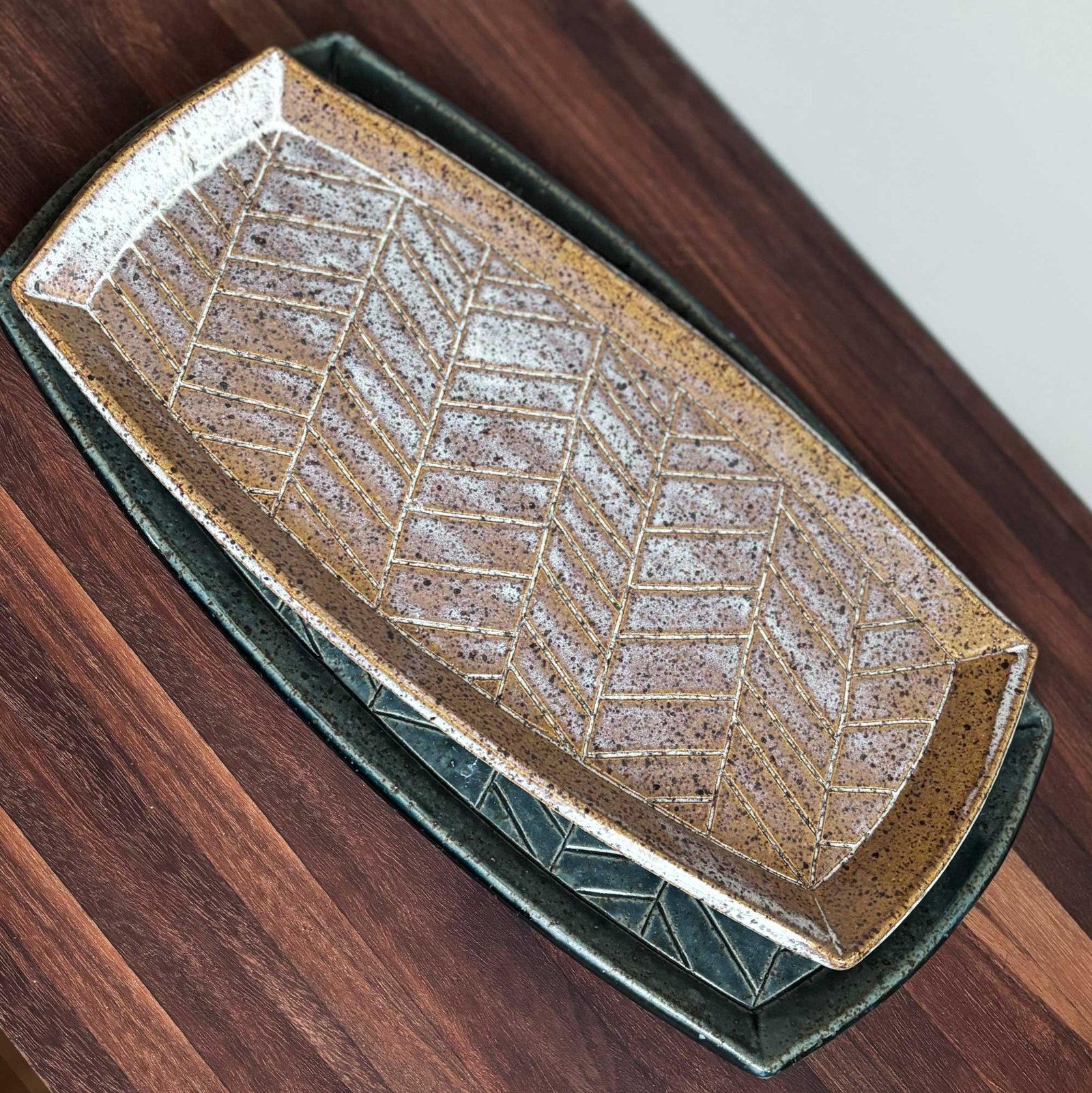 This is the MEDIUM handbuilt slab platter with hand carved pattern.