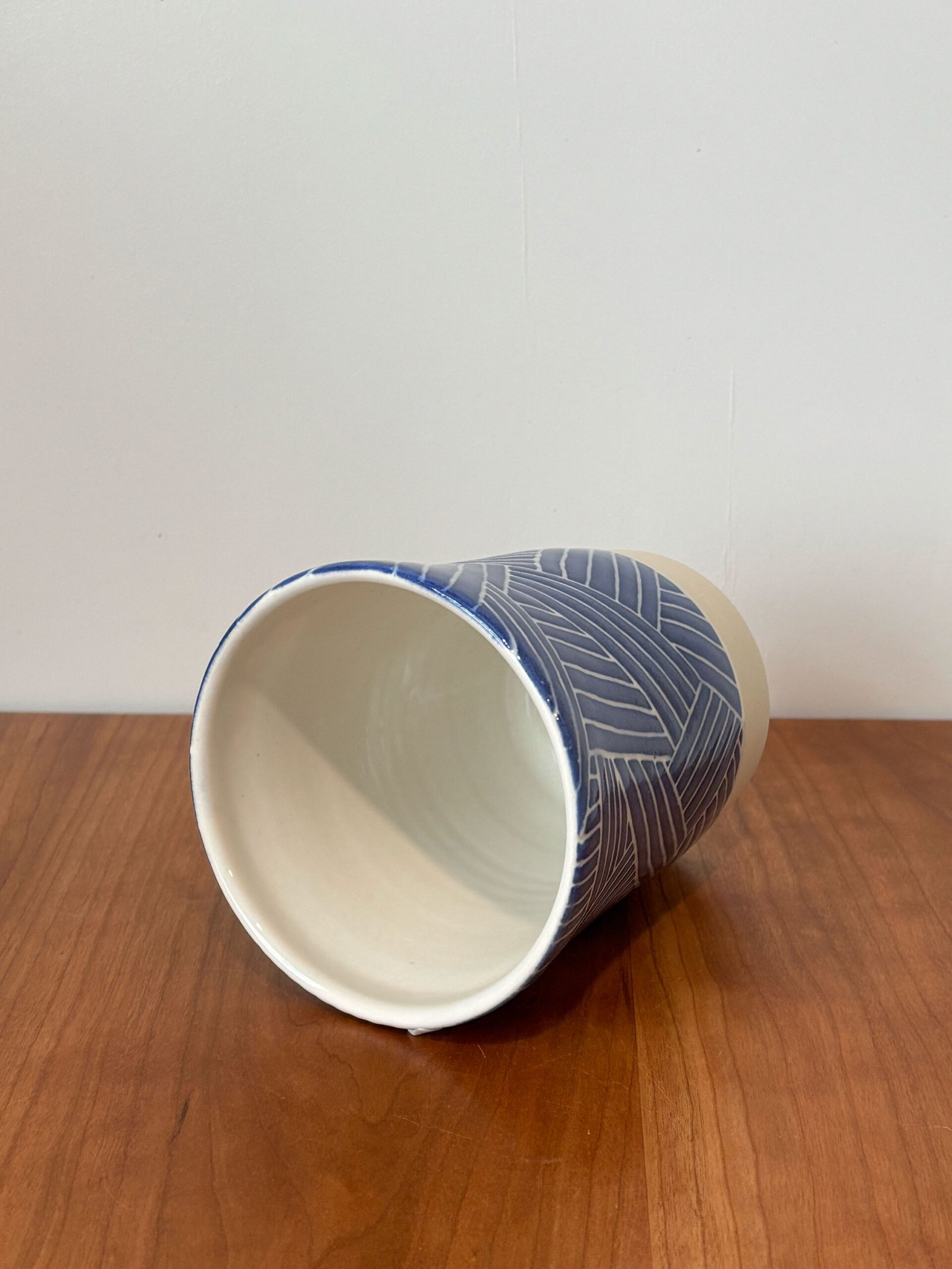 Wheel thrown vase from white clay body. Design is made with a layer of cobalt blue underglaze and carving through to the white clay beneath.
