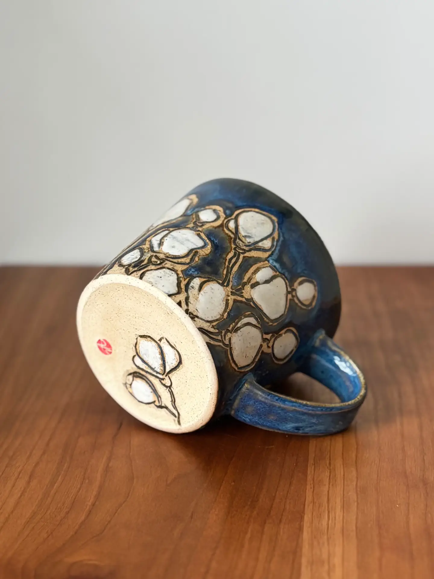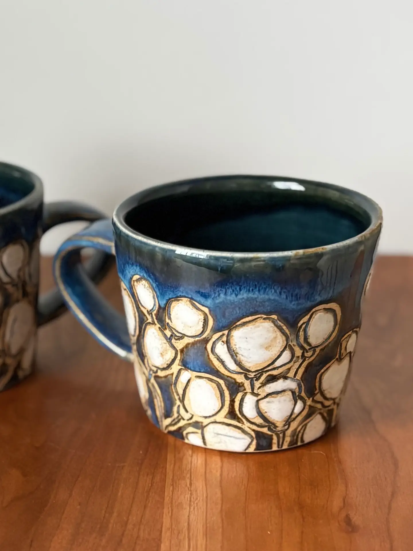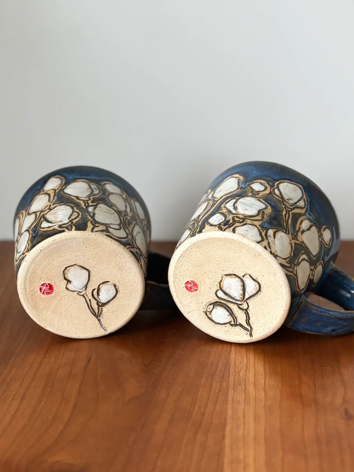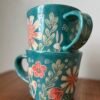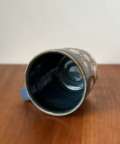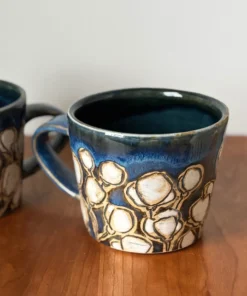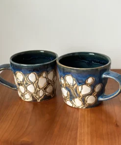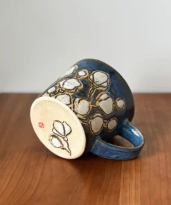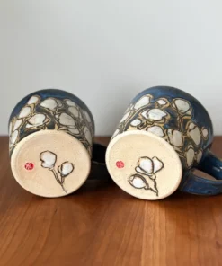 12 oz mug with handle and hand painted and carved with a cherry blossom pattern, even a few on the bottom. Cherry blossoms mark the beginning of spring and the first burst of beauty, a gift from nature.