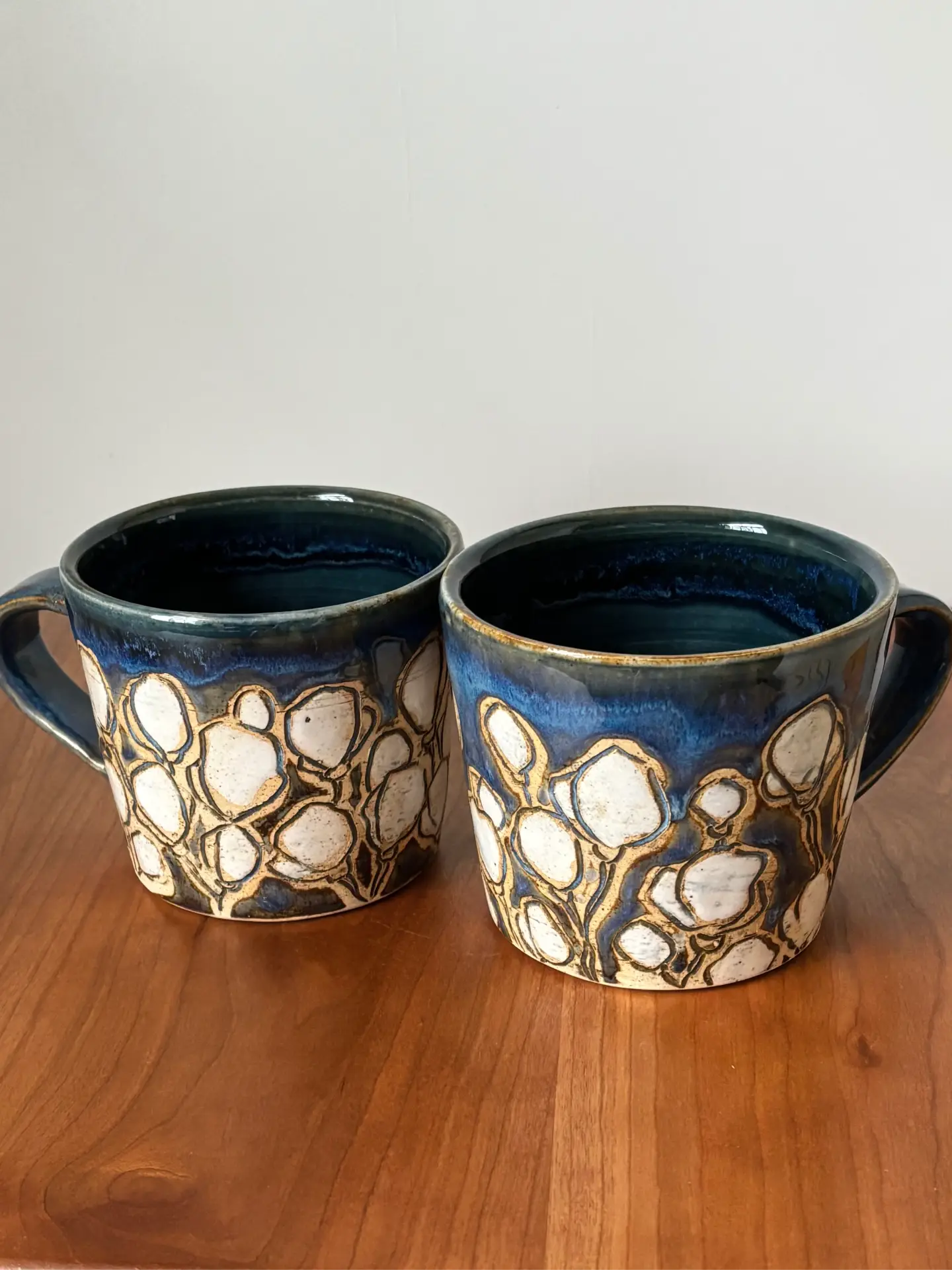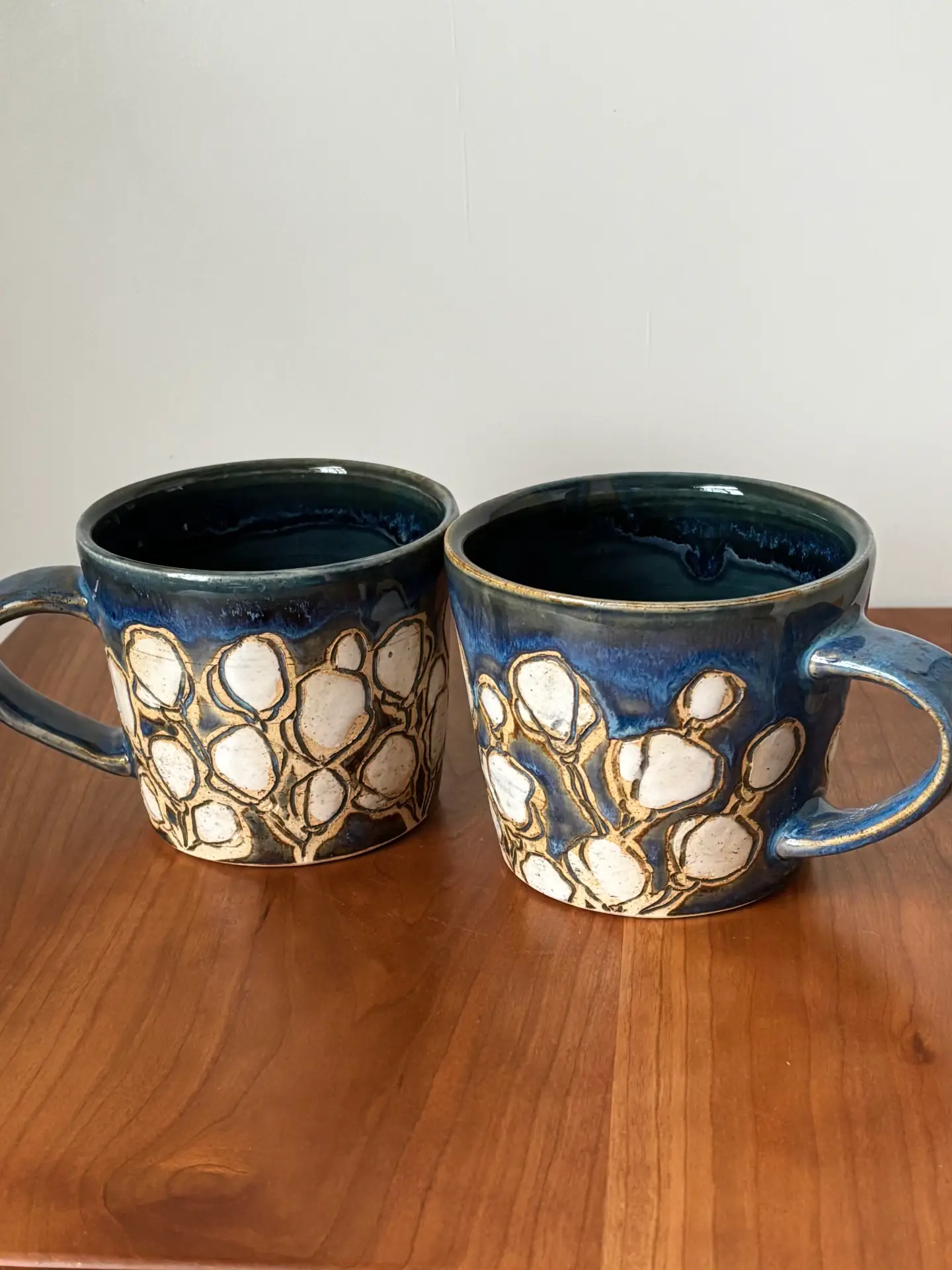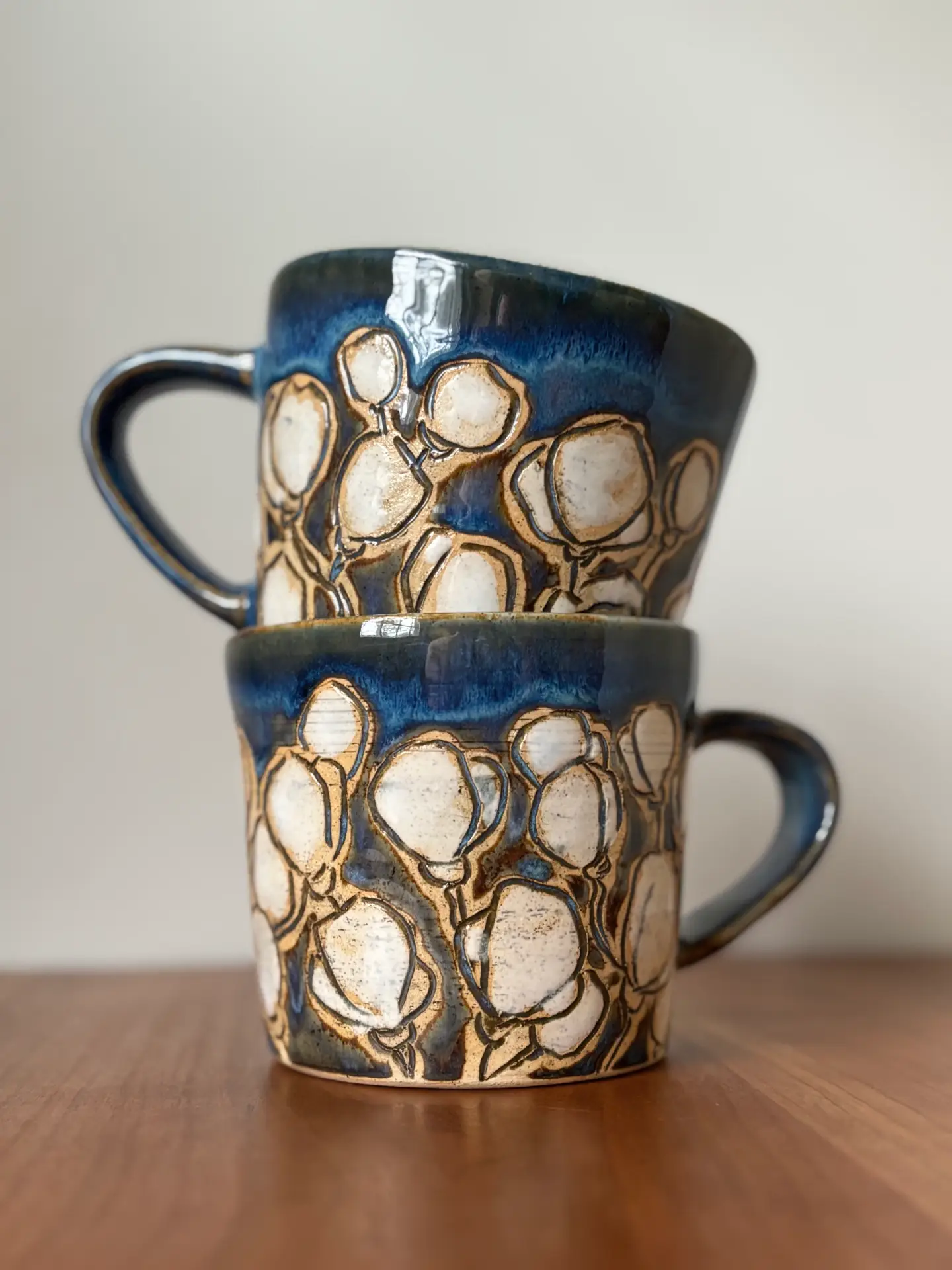 12 oz mug with handle and hand painted and carved with a cherry blossom pattern, even a few on the bottom. Cherry blossoms mark the beginning of spring and the first burst of beauty, a gift from nature.