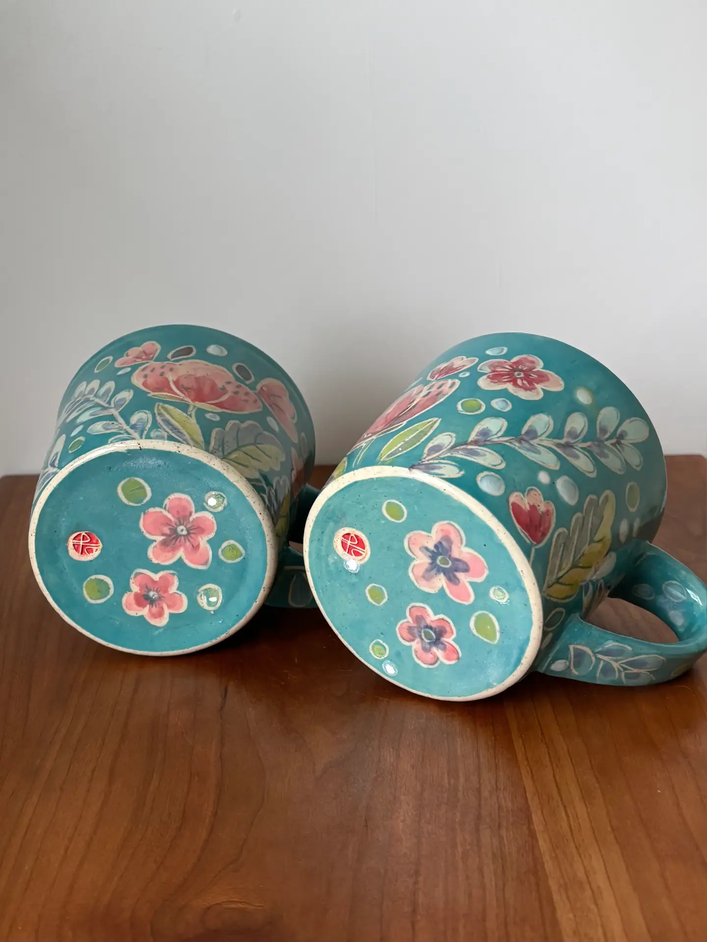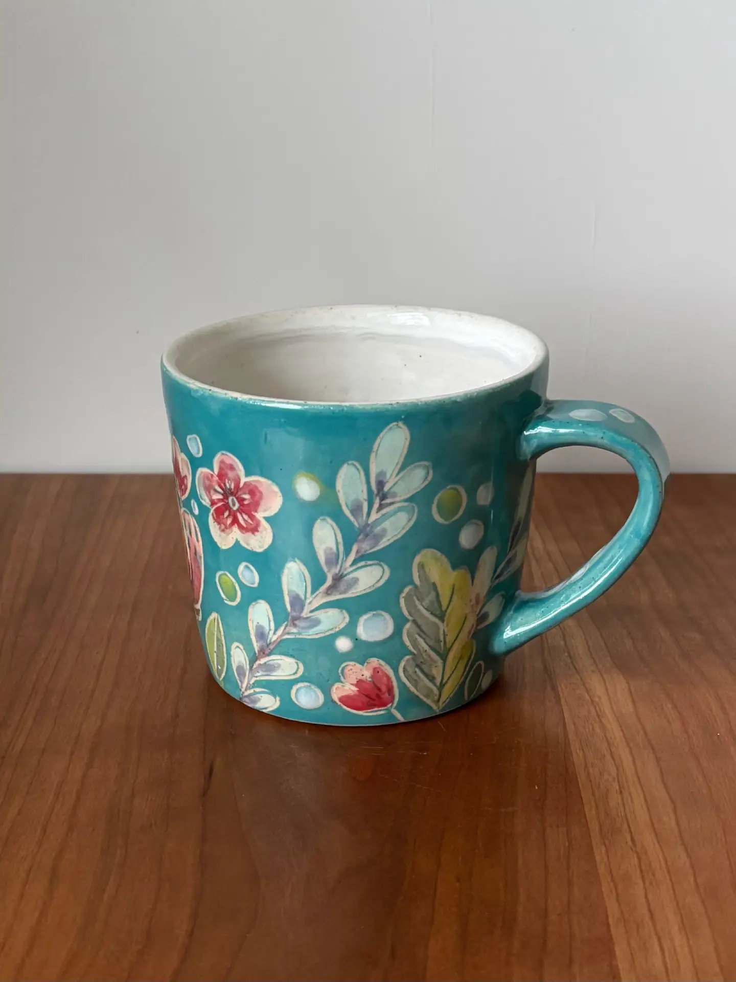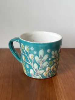 Hand Painted Botanical Pattern Coffee Mug – teal – 12 oz
