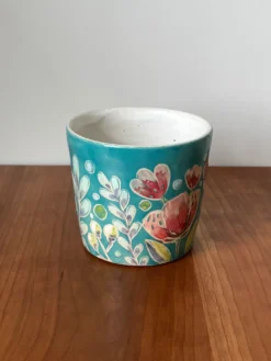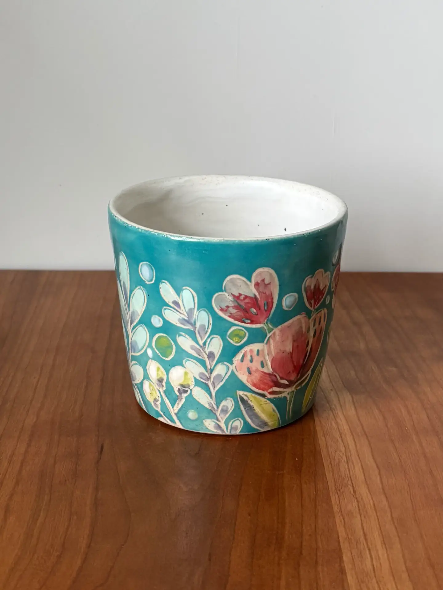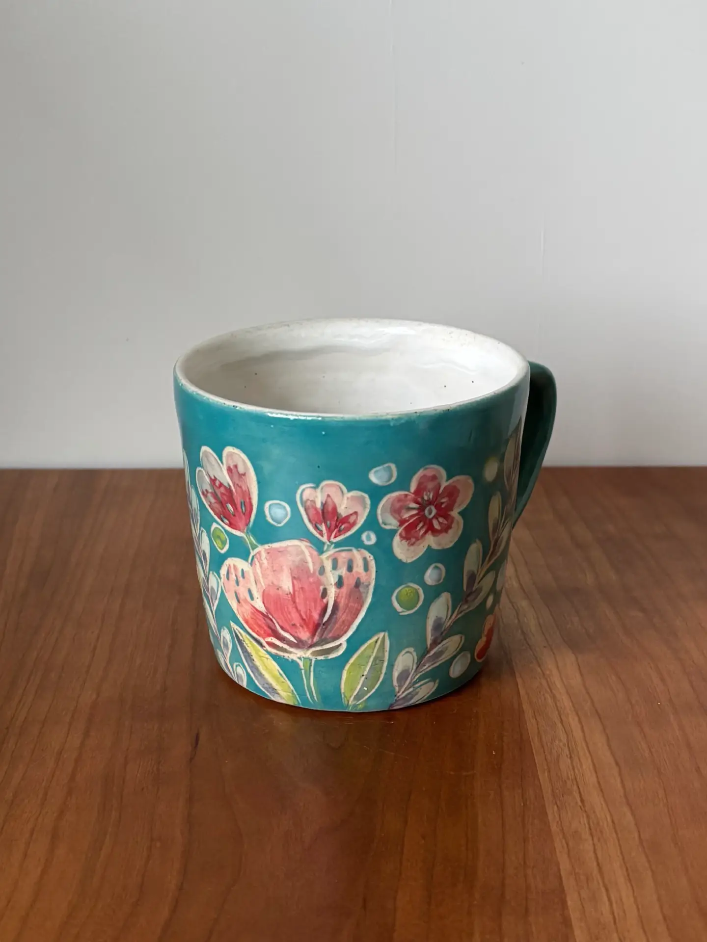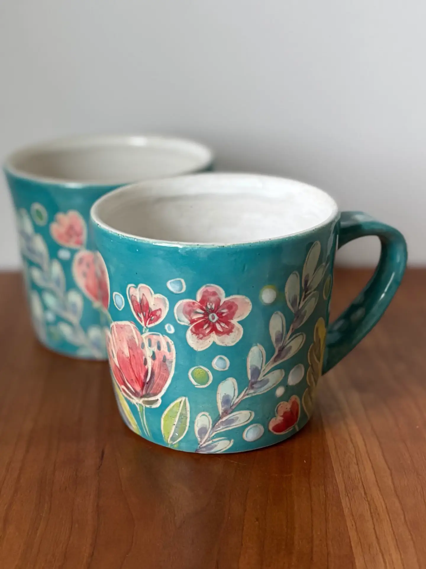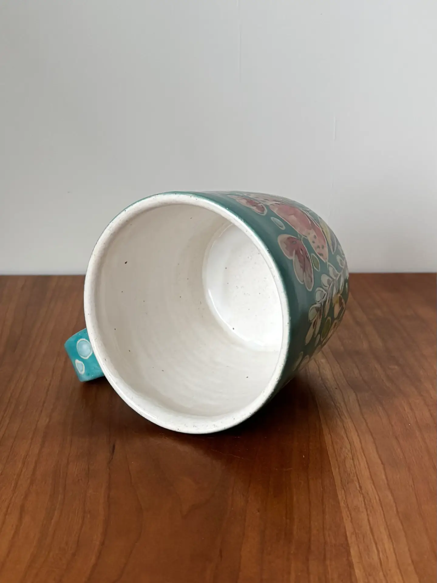 12 oz mug with handle and hand painted and carved with a botanical pattern, even a few on the bottom.