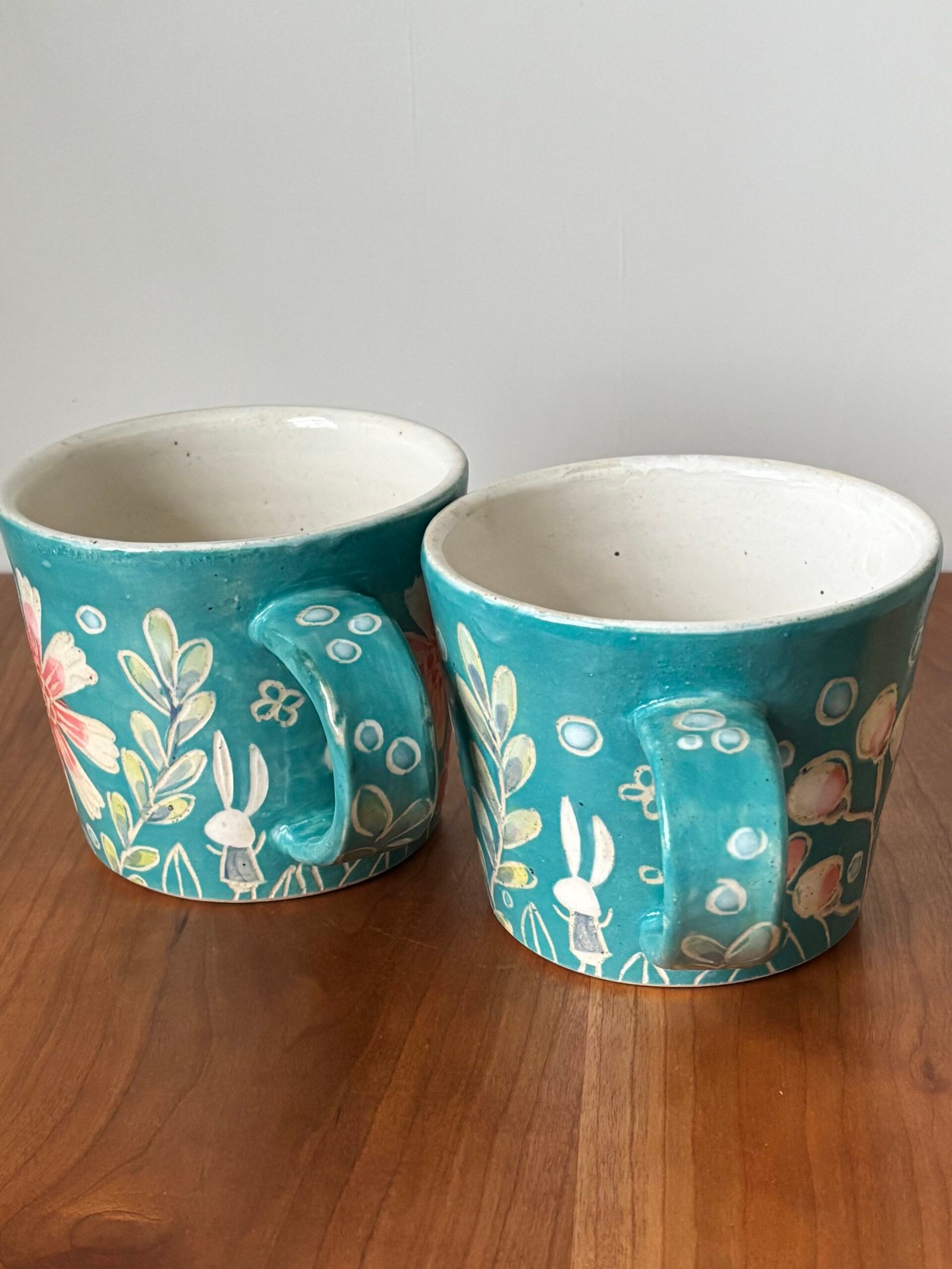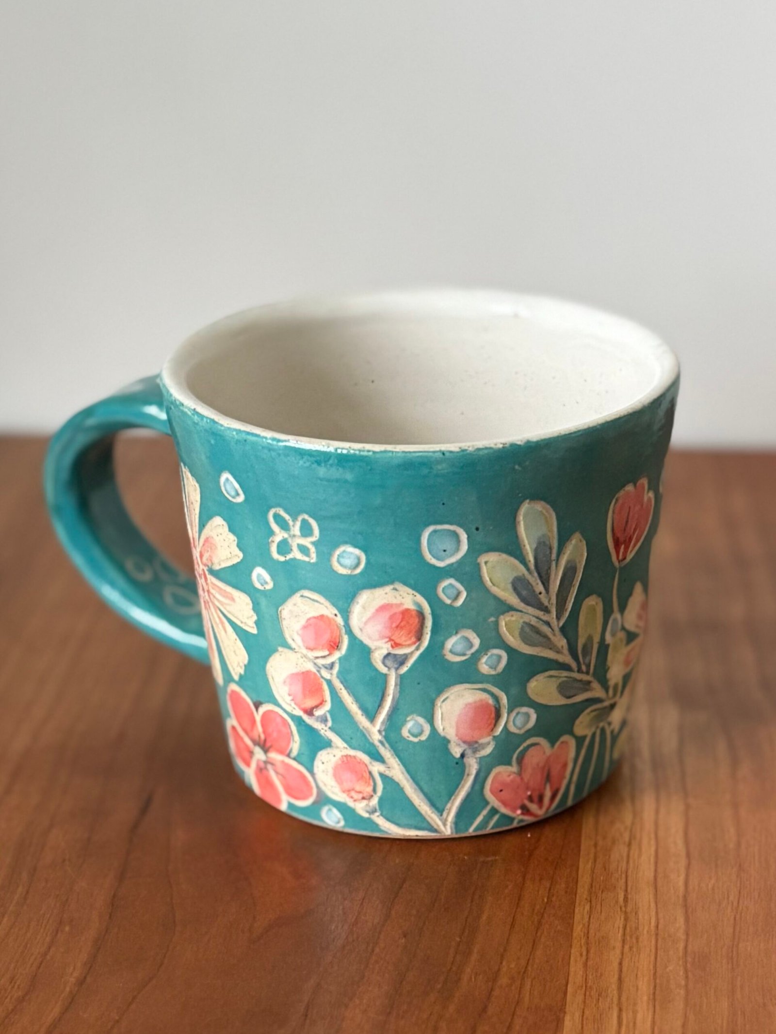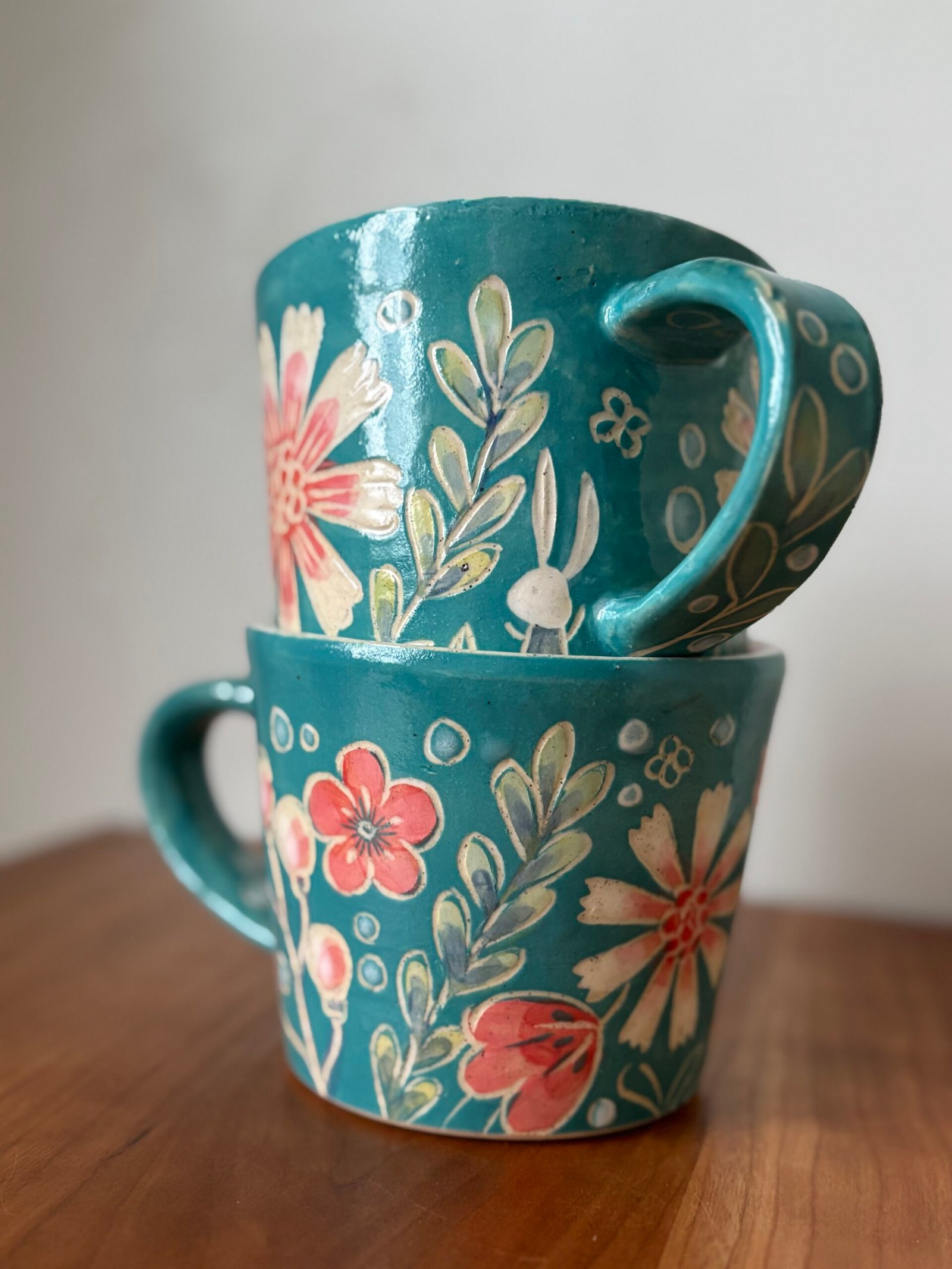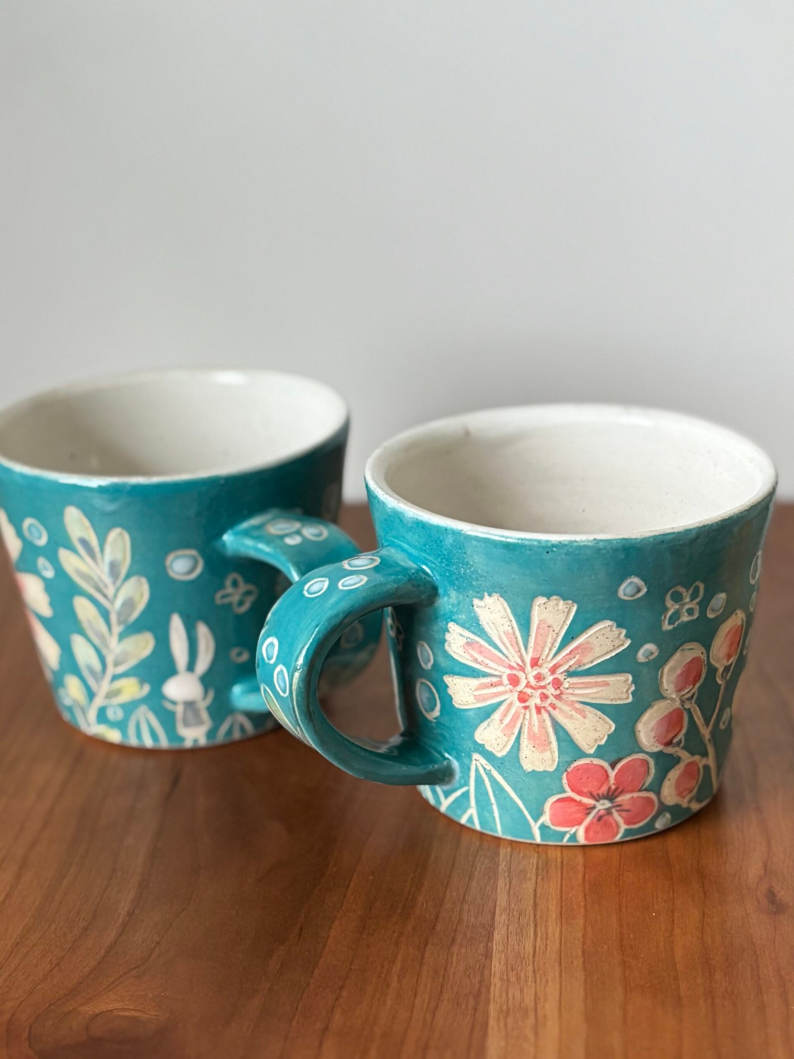12 oz mug with handle and hand painted and carved with a botanical pattern, even a few on the bottom. Can you find the rabbits?