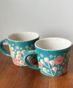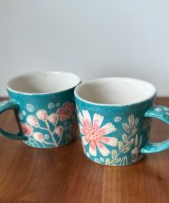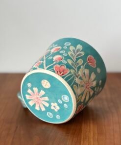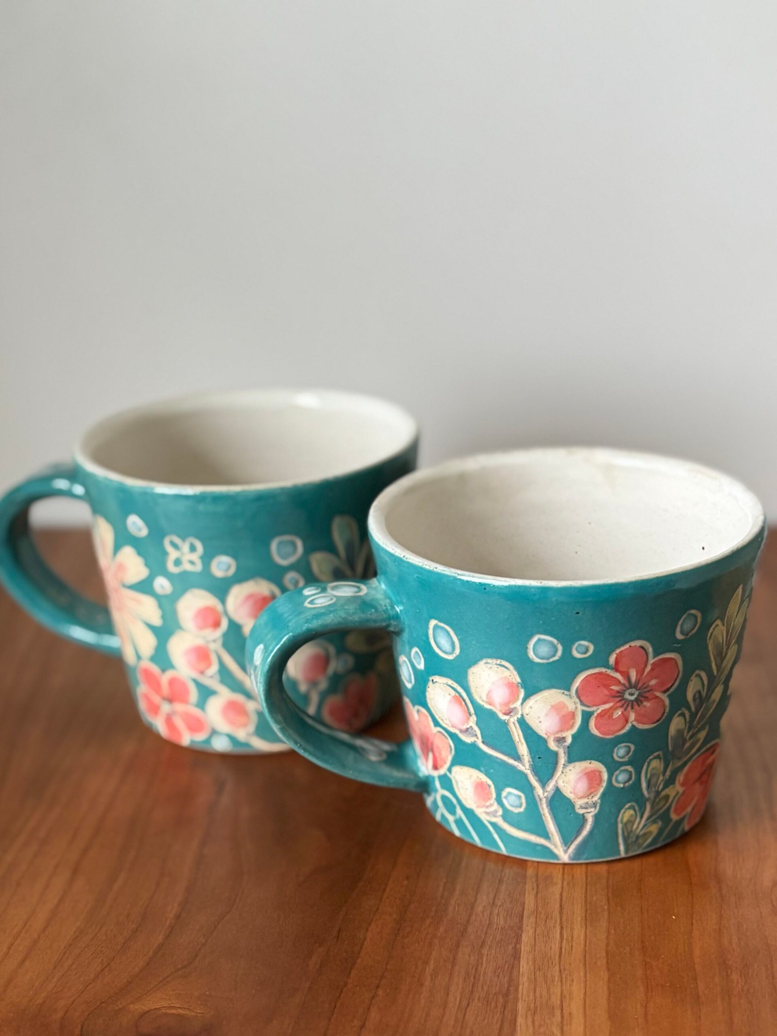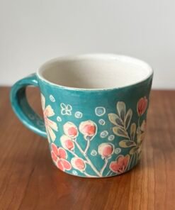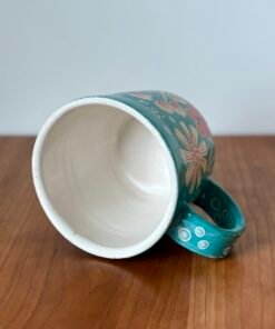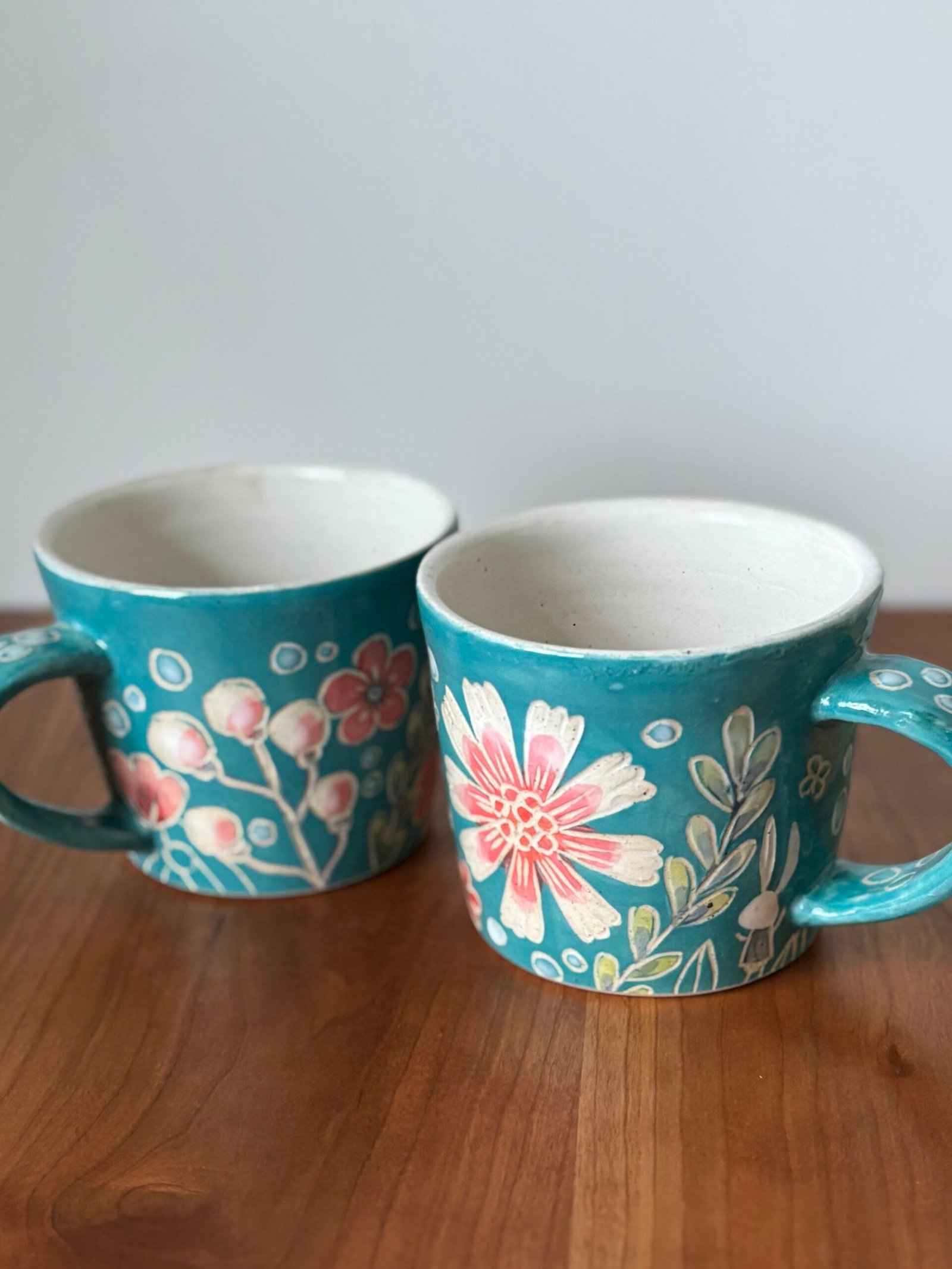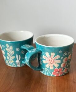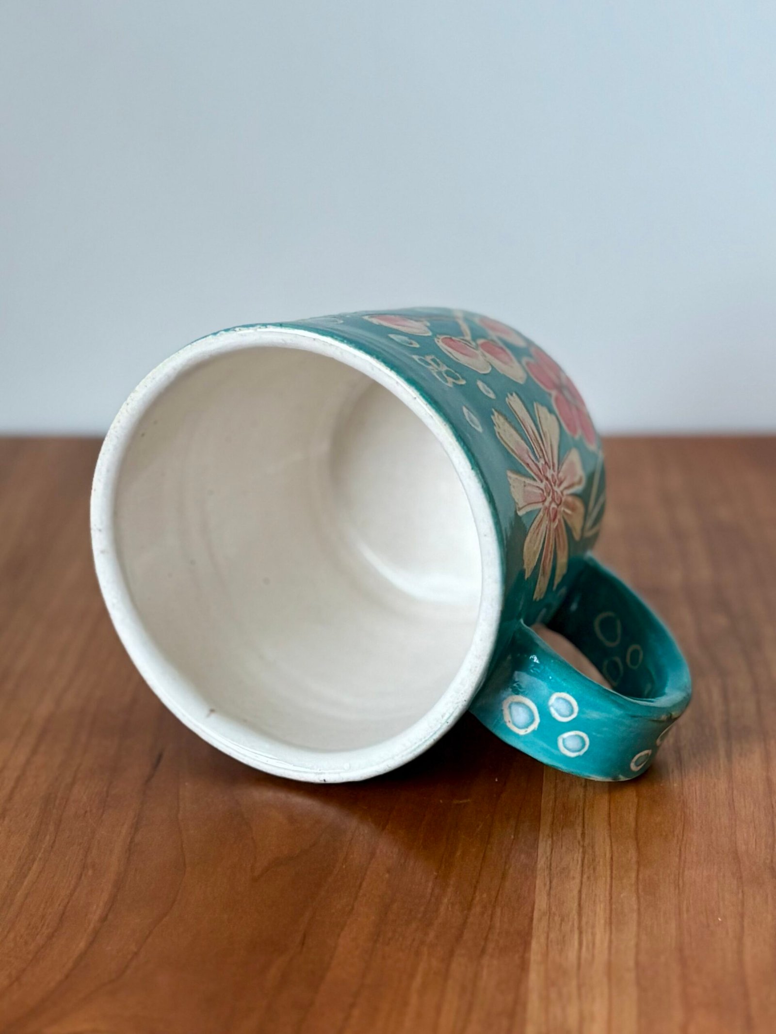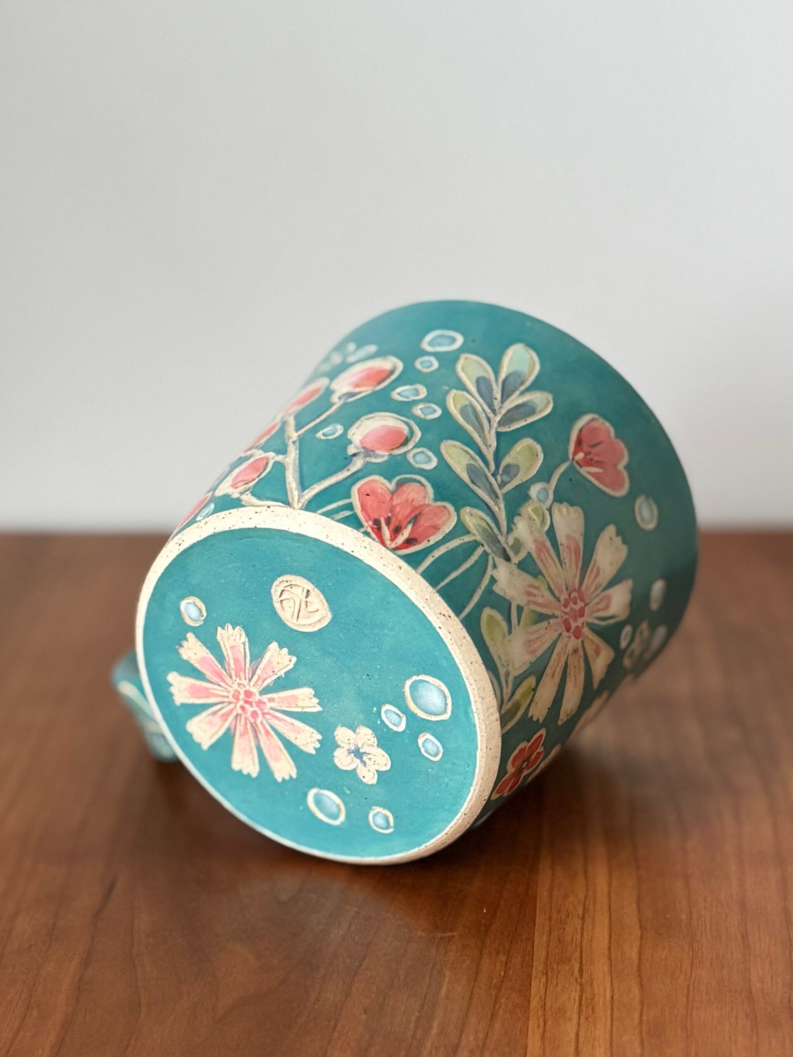 12 oz mug with handle and hand painted and carved with a botanical pattern, even a few on the bottom. Can you find the rabbits?