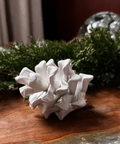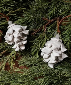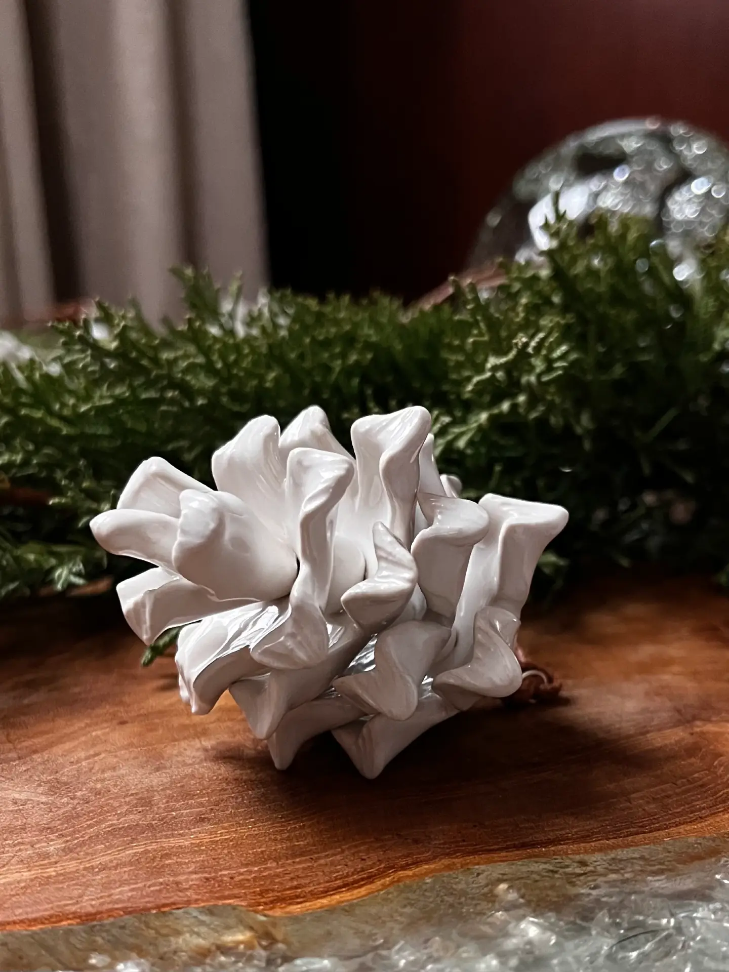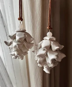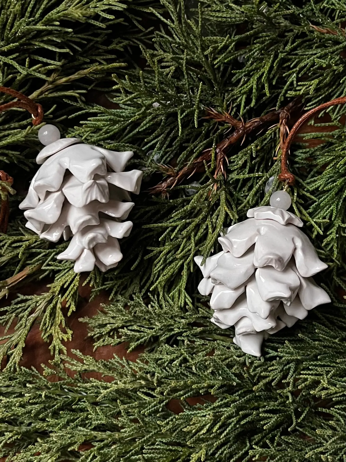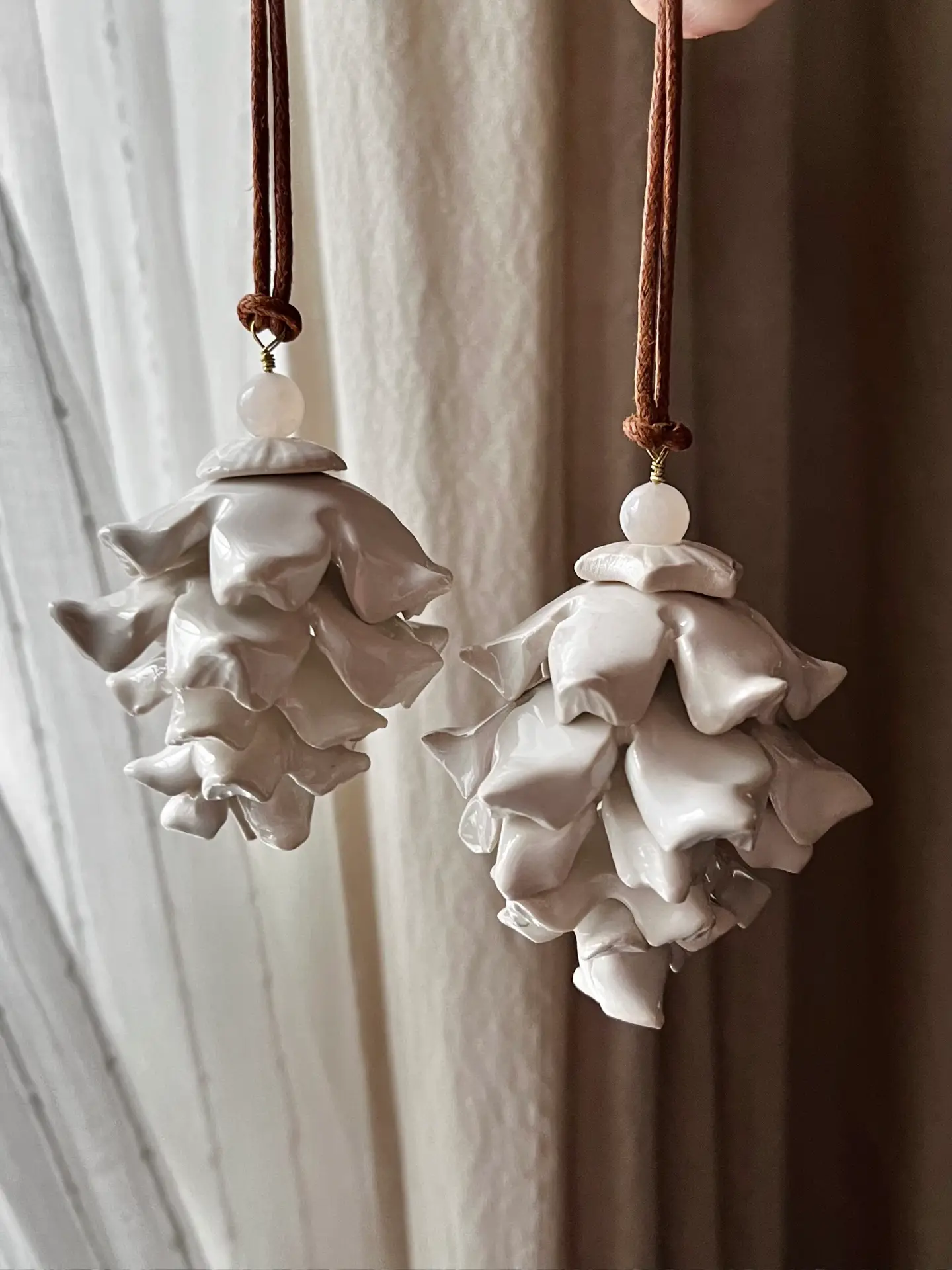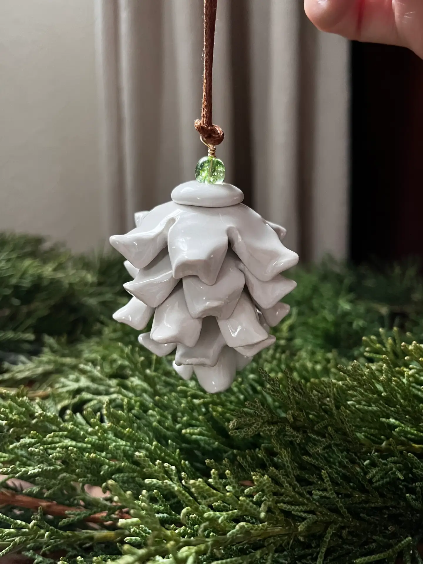 These ornaments are assembled of handmade shaped pieces, in graduated sizes, that when strung on wire with beads between, create an artistic representation of a pinecone that moves and makes a small chiming sound.