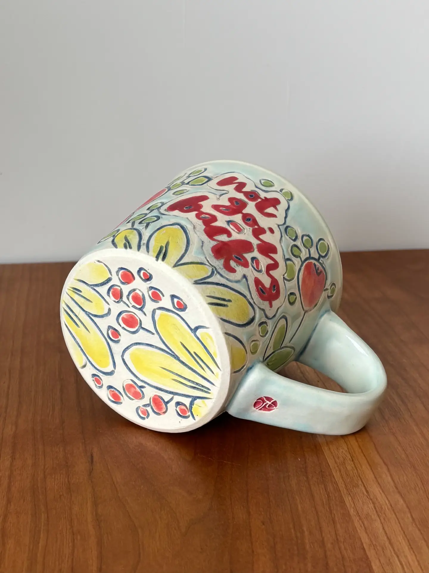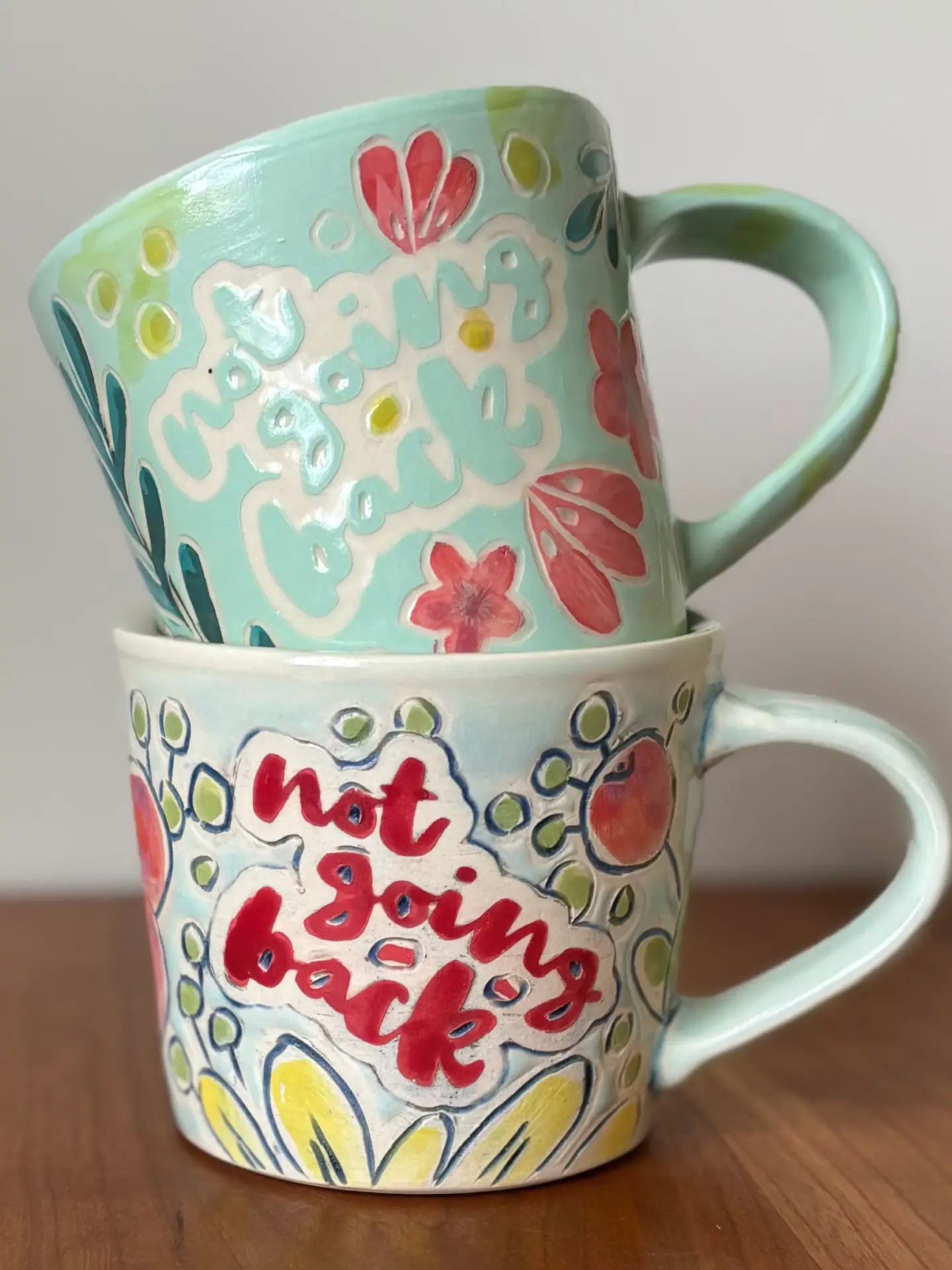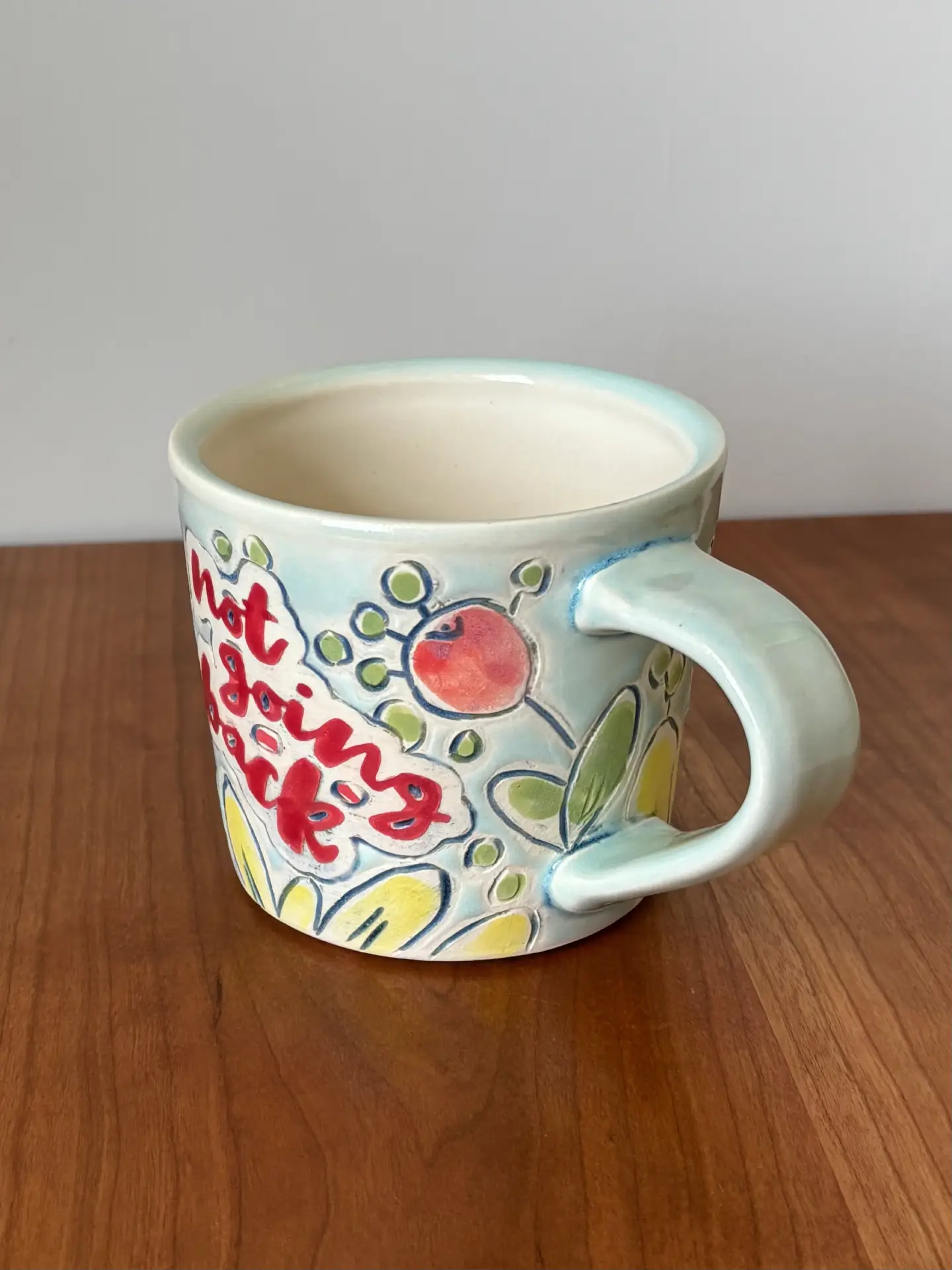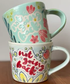 12 oz mug with handle with “NOT GOING BACK” motto in hand painted flower design with a mixture of matte and glaze finish. Glaze is light blue.