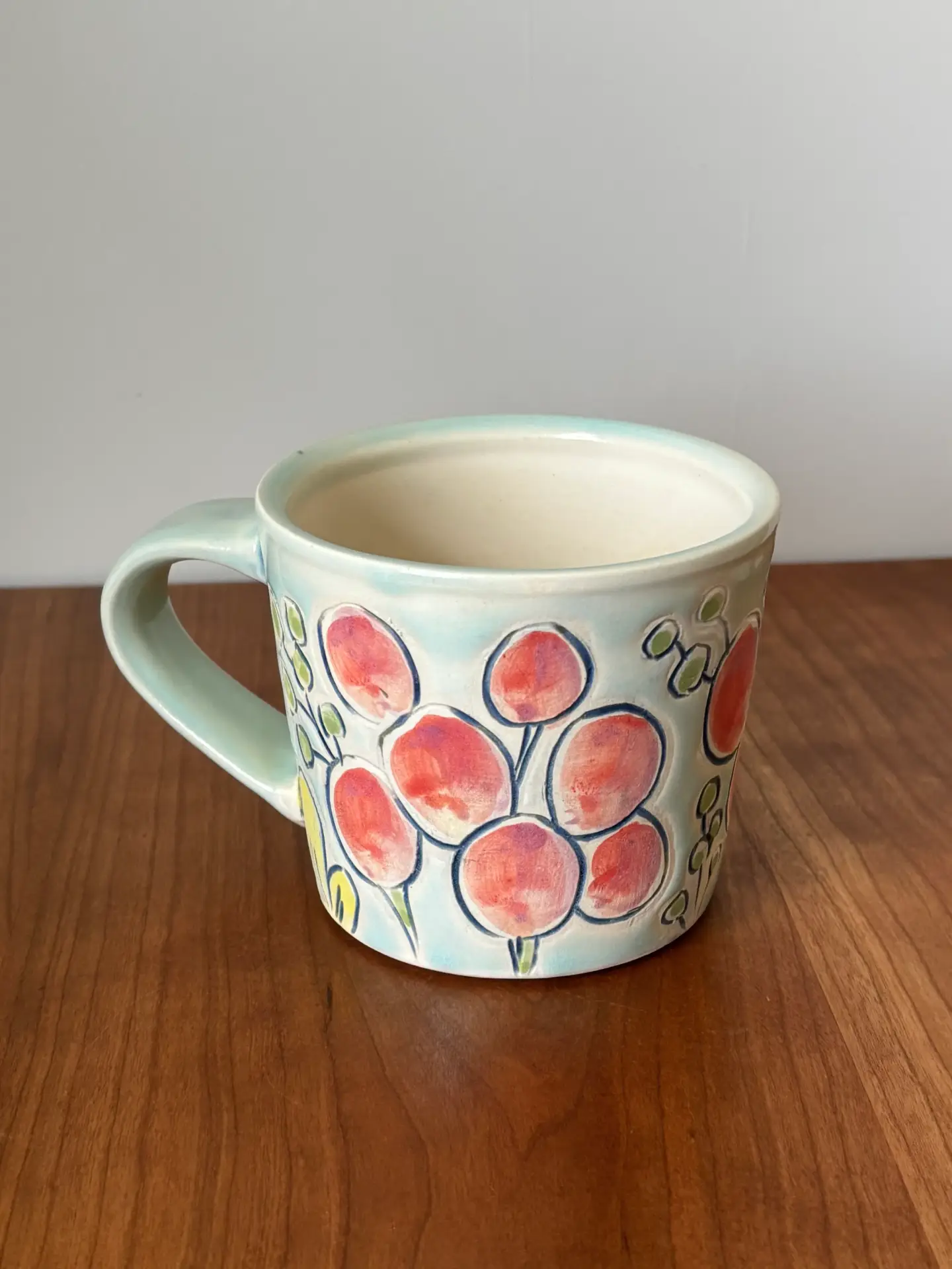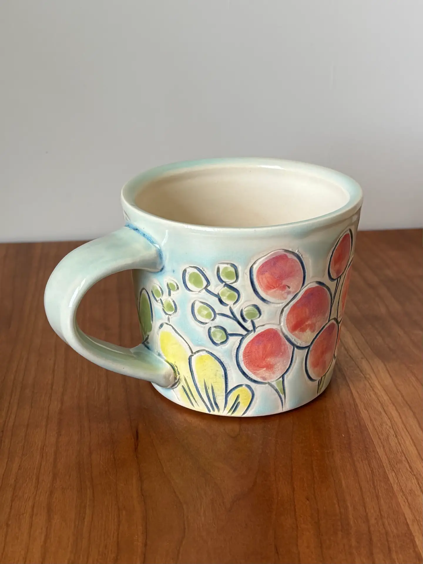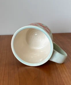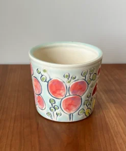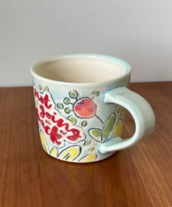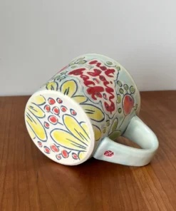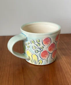 12 oz mug with handle with “NOT GOING BACK” motto in hand painted flower design with a mixture of matte and glaze finish. Glaze is light blue.