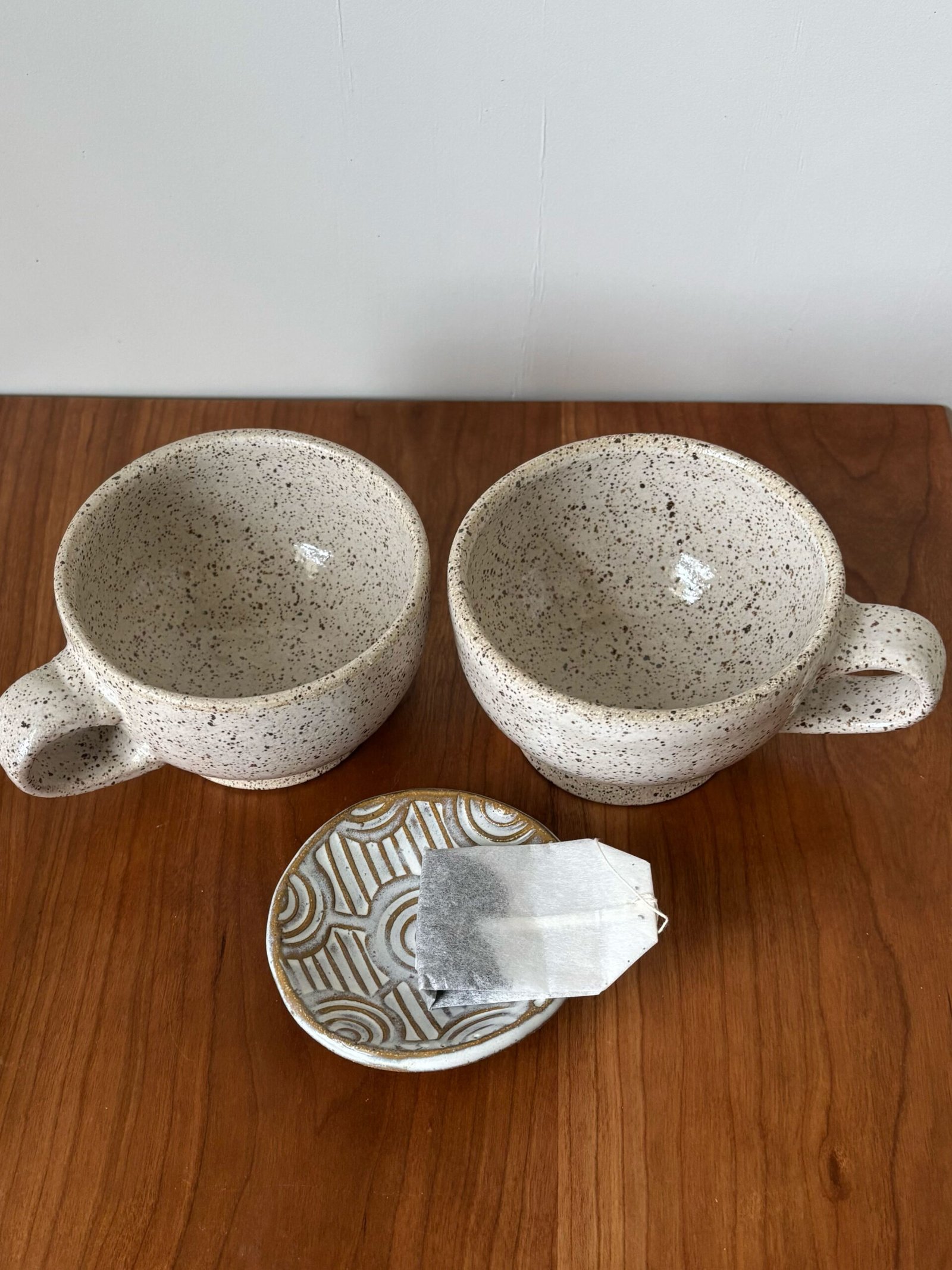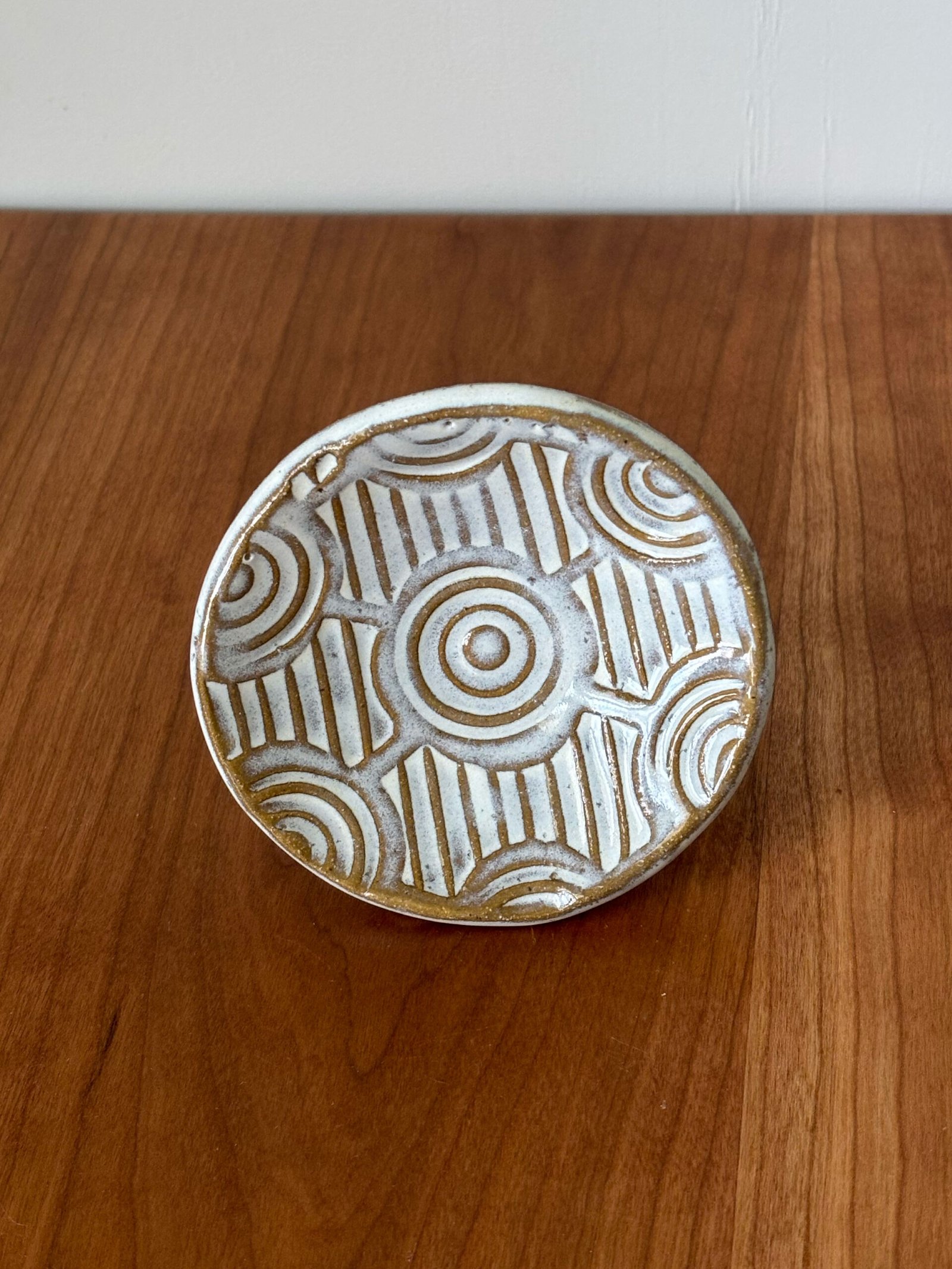 Round Pottery Tea Bag Bowl | stamped with interlocking circles