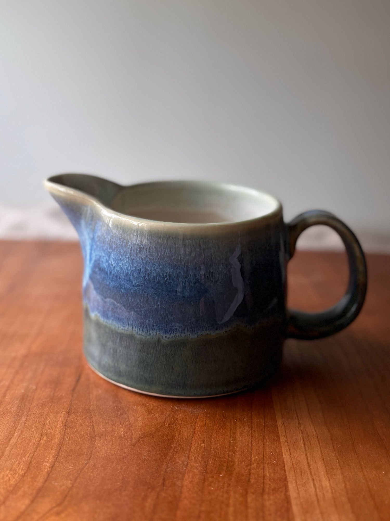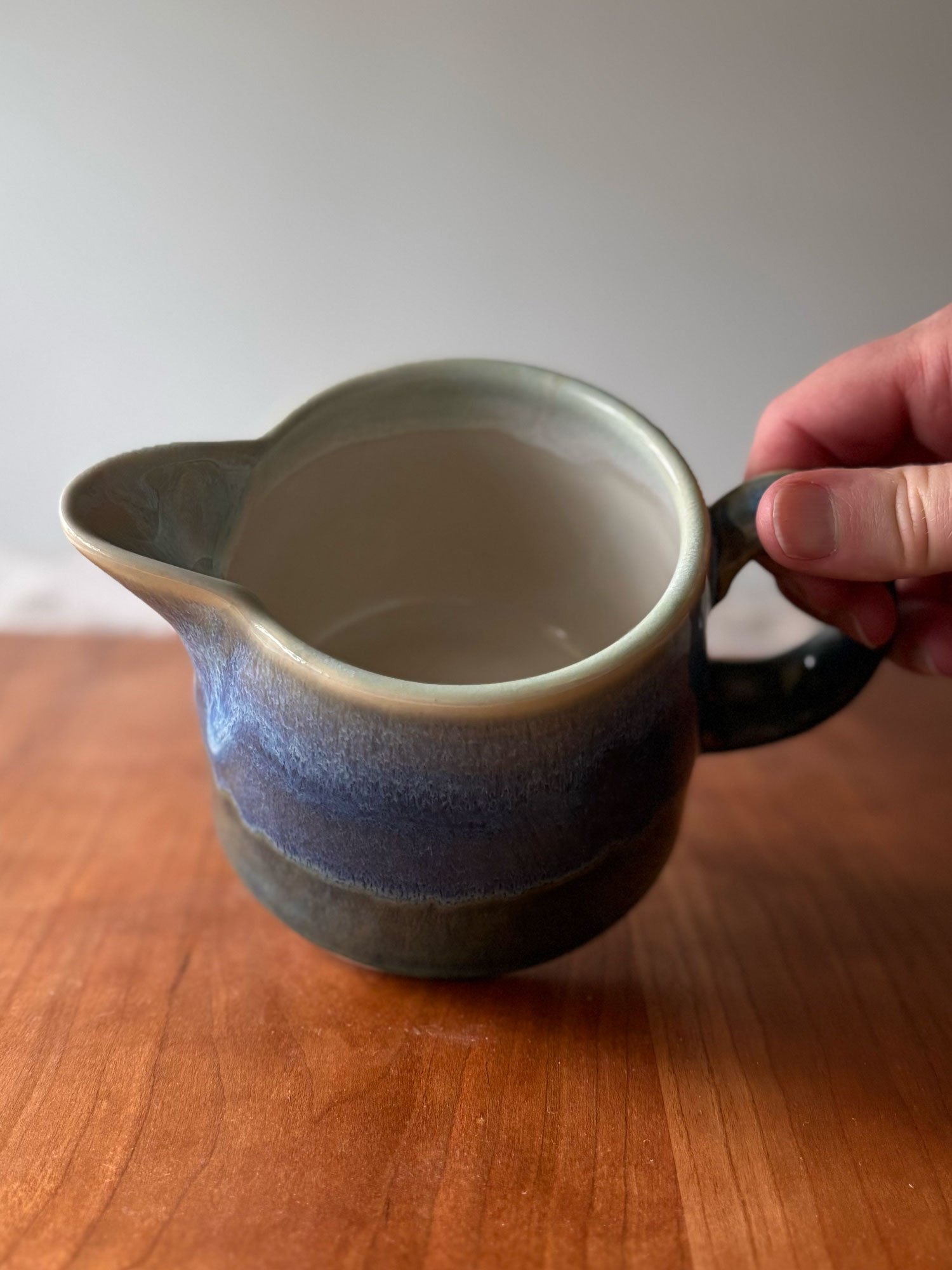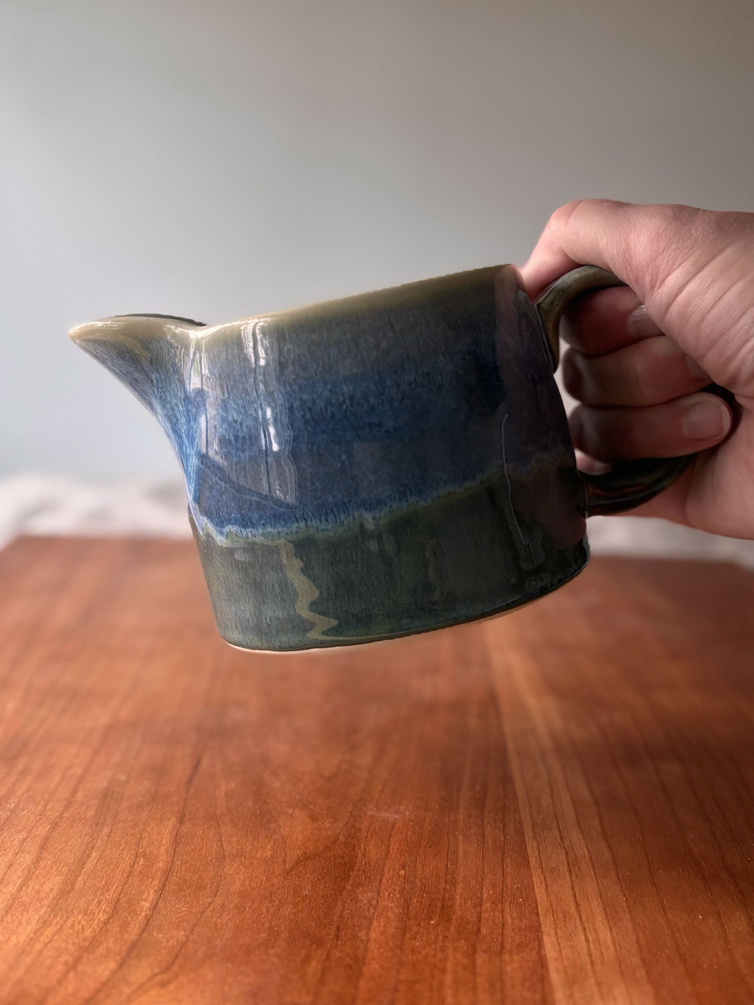 Small wheel thrown pottery pitcher perfect for syrup, gravy, or sauce.